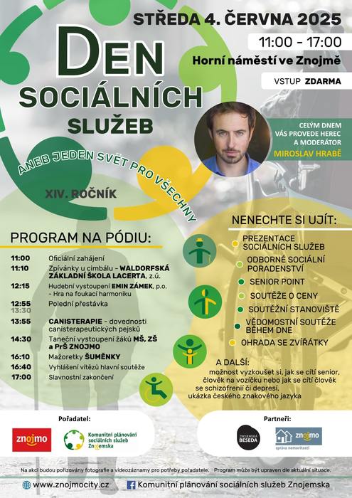 Srdečně vás zveme na "Den sociálních služeb", který se uskuteční ve středu 4. 6. 2025 od 11:00 hodin na Horním náměstí ve Znojmě. Na akci se představí různá zařízení poskytující sociální služby ve Znojmě a okolí – chybět nebude ani náš stánek, kde se s vámi rádi osobně setkáme a přiblížíme vám naši službu. Více informací o programu naleznete v přiloženém letáku.