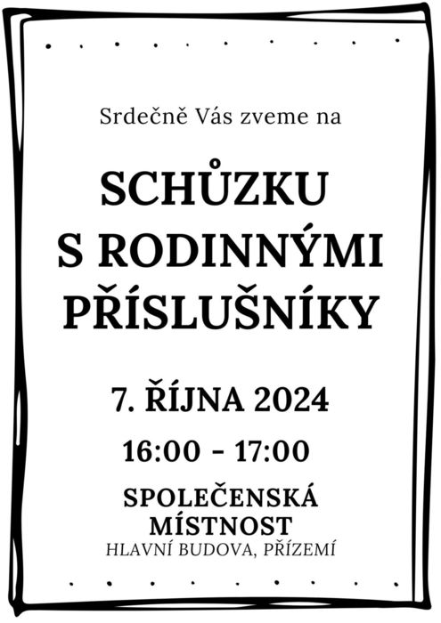 Srdečně Vás zveme na schůzku vedení s rodinnými příslušníky. Schůzka proběhne 7. 10. 2024 v 16:00 ve společenské místnosti. Budou promítány fotografie z různých aktivit a společných akcí.