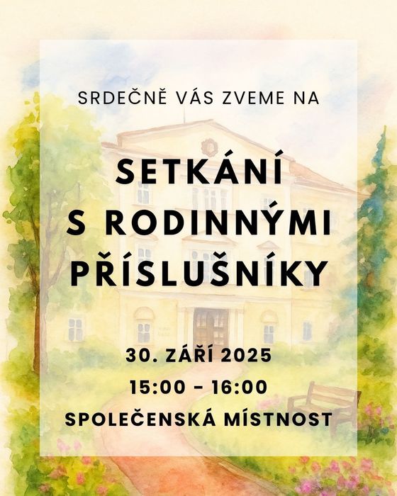 Srdečně zveme rodinné příslušníky uživatelů na setkání s vedením, které proběhne v úterý 30. září 2025 od 15:00 do 16:00 ve společenské místnosti. Během setkání se dozvíte aktuální informace, budete mít prostor pro své dotazy a společně nahlédneme do každodenního života prostřednictvím fotografií z aktivit a akcí. Těšíme se na vaši účast!