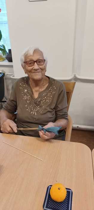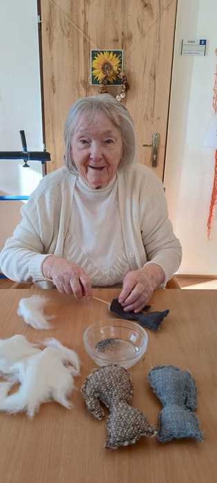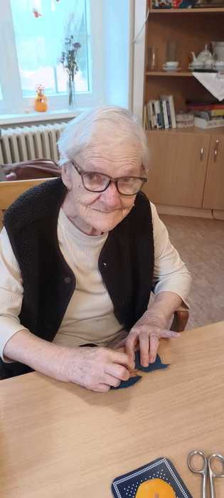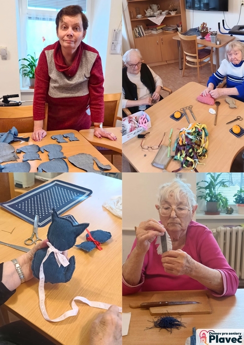 V rámci aktivizace se klientky společně s pečovatelkou pustily do tvoření z rifloviny. Ze starých riflí vznikala peříčka a kočky s barevnými mašličkami, které zkrášlí naše prostory a přinesly spoustu radosti při společné práci. Riflovina se ukázala jako skvělý materiál – pevný, ale přitom příjemný na dotek. Každá dekorace tak získala svůj osobitý vzhled. Aktivizační činnosti jsou oblíbenou součástí našich dnů – přinášejí nejen zábavu a tvůrčí vyžití, ale také pocit smysluplnosti a společného sdílení.
