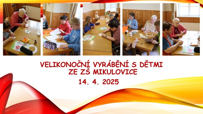 V pondělí 14. 4. 2025 nás navštívili žáci ze ZŠ Mikulovice. V rámci projektu ,,Propojení generací“ s našimi uživateli vyráběli velikonoční dekorace. Žáci přišli na oddělení, kde si každý vyzvedl uživatele a doprovodil do společenské místnosti. Před vyráběním měli žáci připravené malé vystoupení. Při vyrábění si společně povídali o Velikonocích. Společné vyrábění se uživatelům velice líbilo. Děkujeme paní učitelce a hlavně žákům za zpříjemnění celého dopoledne a těšíme se na další setkání.